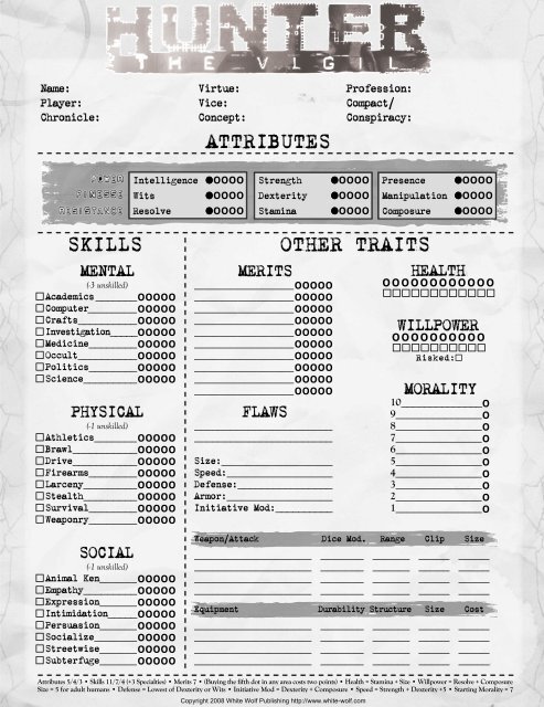 That may be useful to players and storytellers both from Hunter. Free online character sheet generator for World of Darkness games. The Vigil Rulebook September 10.