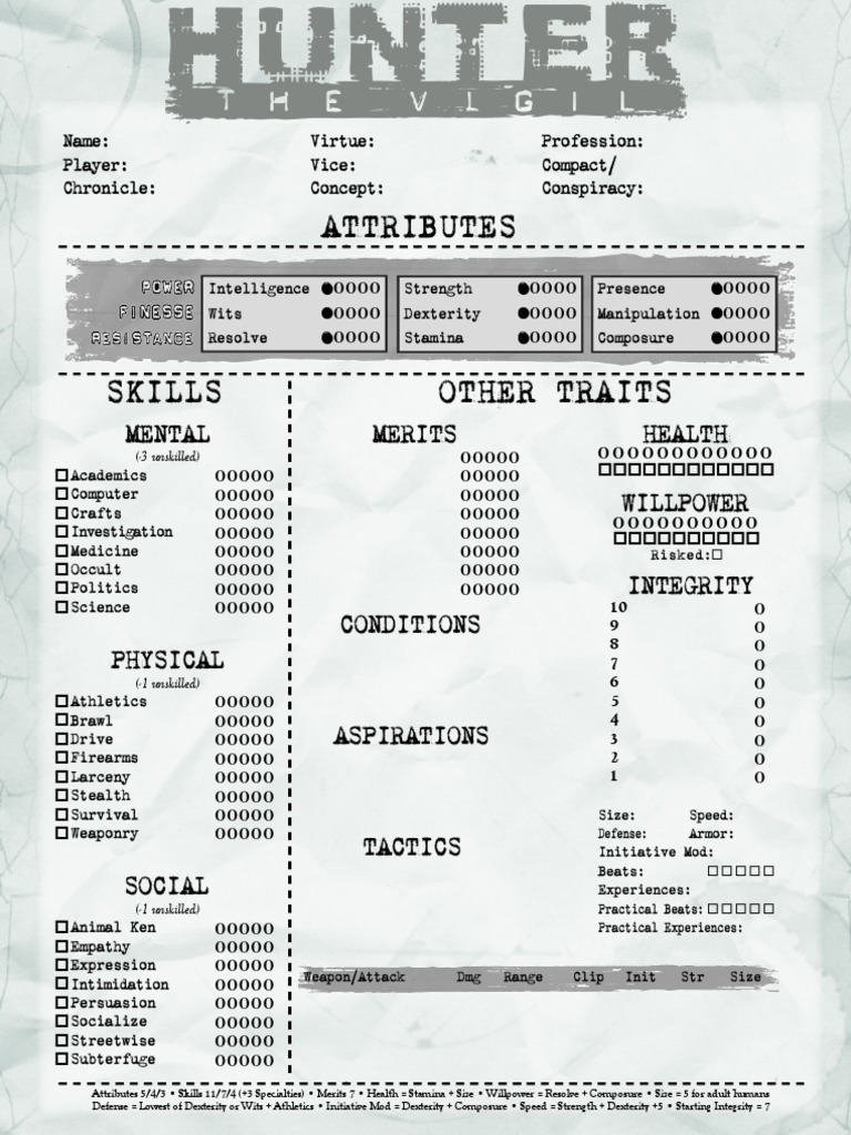 The Vigil 1 PDF. Average Rating 2 ratings 2-Page Interactive Character sheets for Hunter. For example it would include things like how beats are awarded combat references with modifiers uses for Willpower etc.