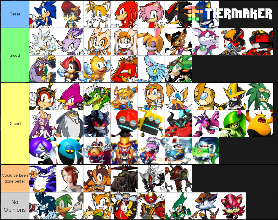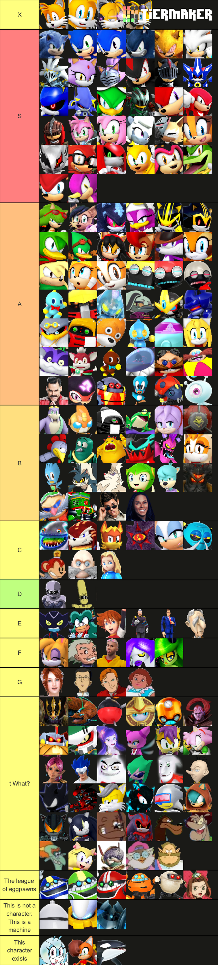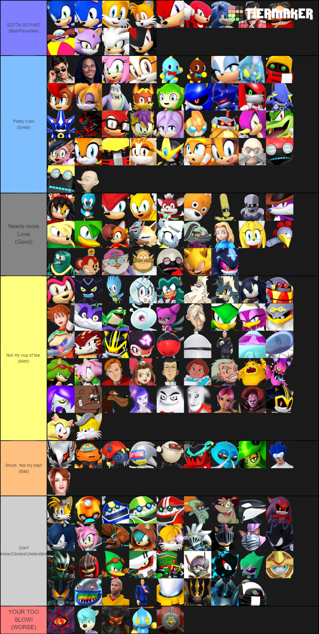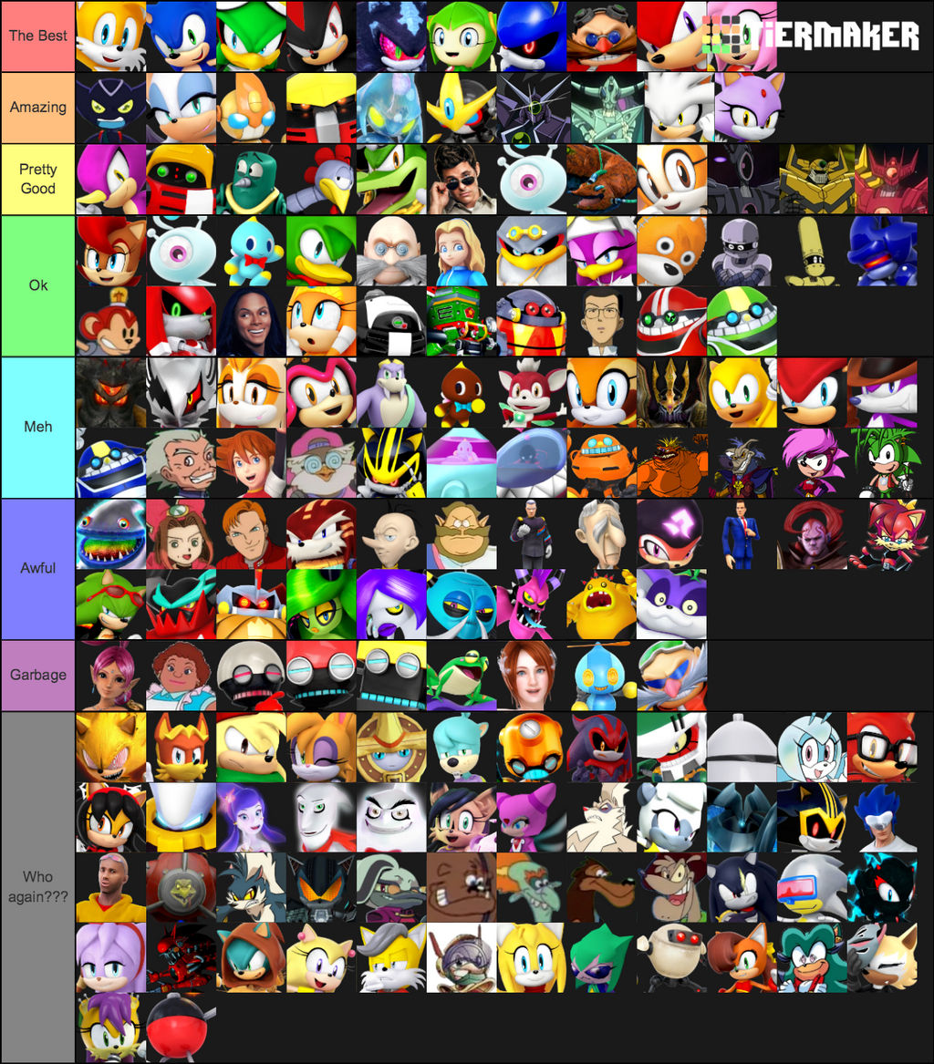 Now I know more characters and have changed my opinions of some characters so Ive updated my list. Sonic Characters Tier List Updated and Expanded A few months ago I made a Sonic characters tier list. I partook in some Sonic-related TierMaker lists but found them wanting so we created our own featuring characters from SEGA Archie IDW.
