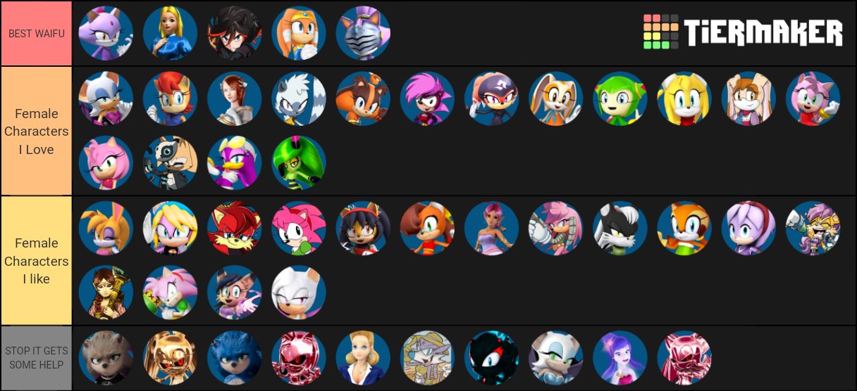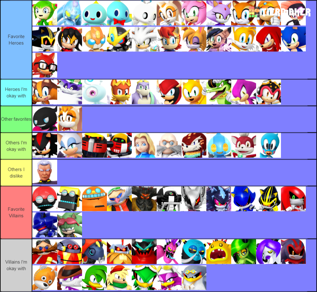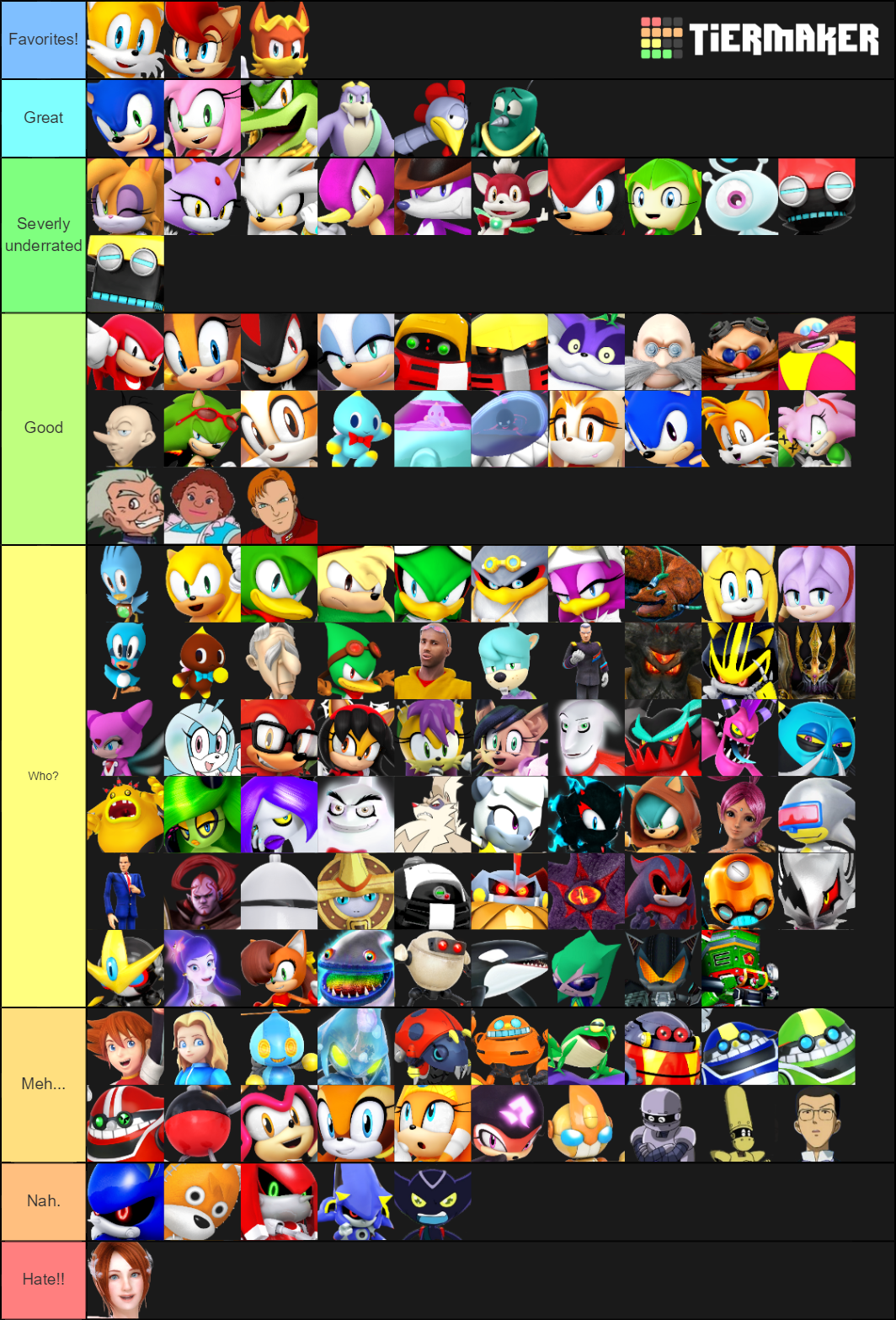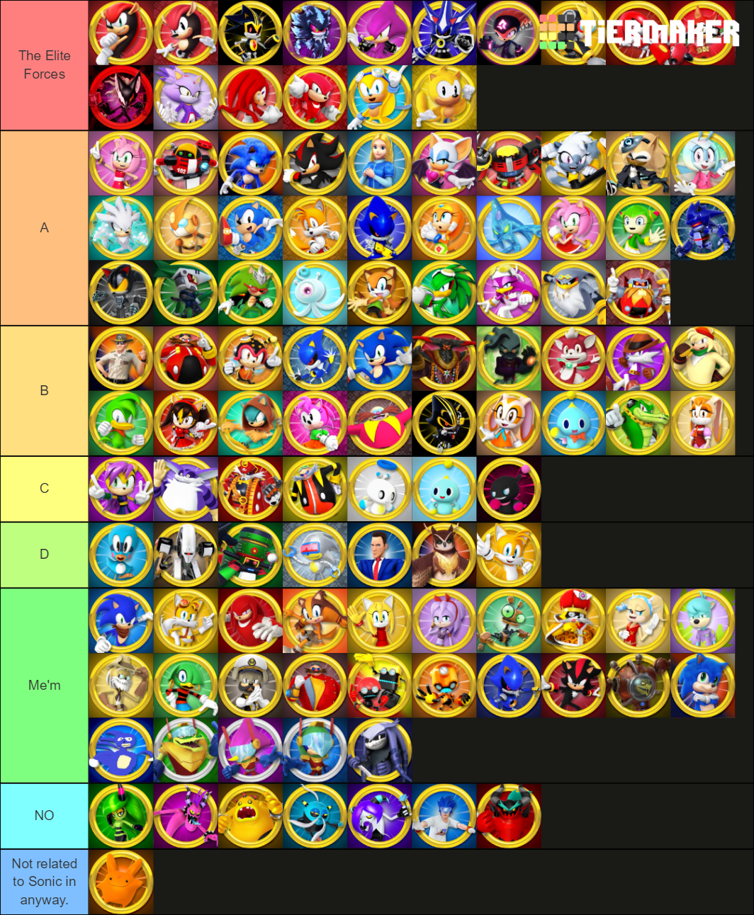 Now I know more characters and have changed my opinions of some characters so Ive updated my list. Sonic Characters Tier List Updated and Expanded A few months ago I made a Sonic characters tier list. I partook in some Sonic-related TierMaker lists but found them wanting so we created our own featuring characters from SEGA Archie IDW.