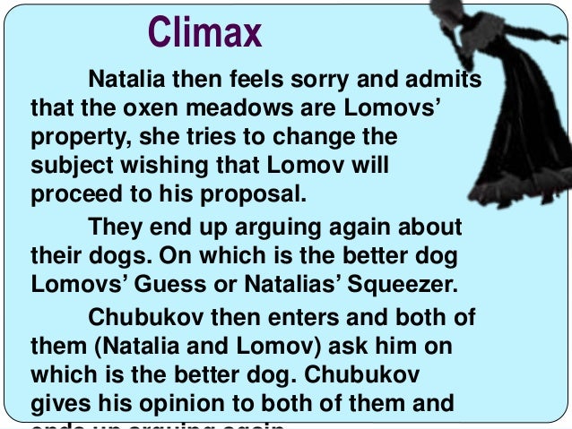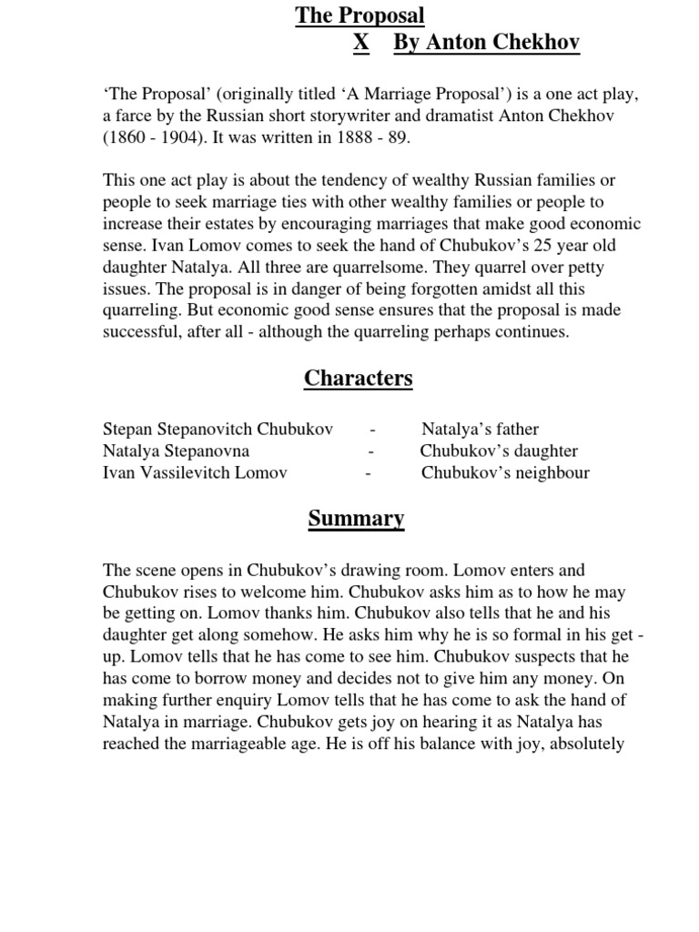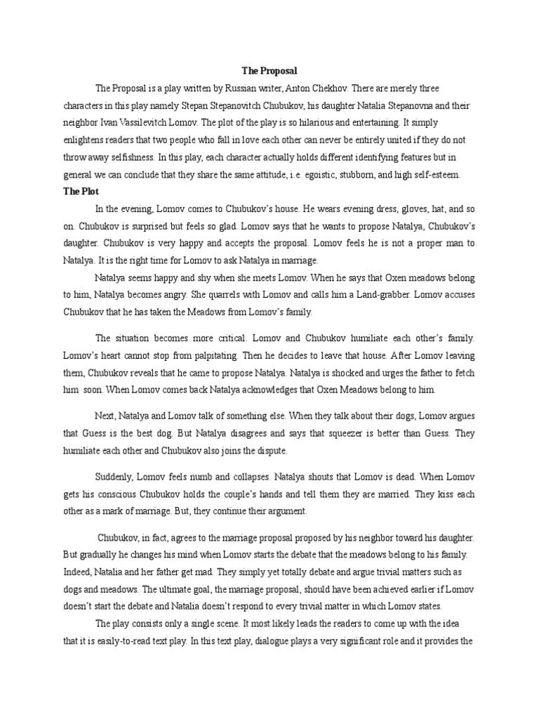 The verbal fights over Oxen Meadows and dogs are really full of humour. It is because of the characters and subject matter and how they behave. The Proposal Prose This play is about a marriage proposal discussion among three characters Ivan Lomov a wealthy neighbour of Stepan Chubukov who is also an affluent person and his twenty-five-year-old daughter Natalya Stepanovna.