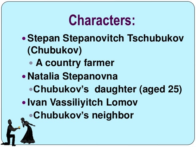 This shows that he was quite quarrelsome as well as short-tempered in nature. Lomov visits Chubukov to seek his daughters hand in marriage. A Chubukov has been hoping for Lomovs marriage for his daughter Natalya.