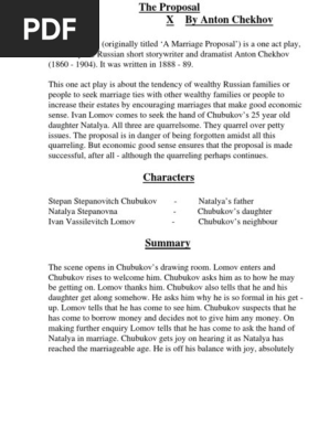 Chubukov is a caring sensible father to both Natalya and his business. The Proposal Class 12 pdf 2. 3Give a character sketch of Natalya in the one-act drama The Proposal by Anton Chekhov.