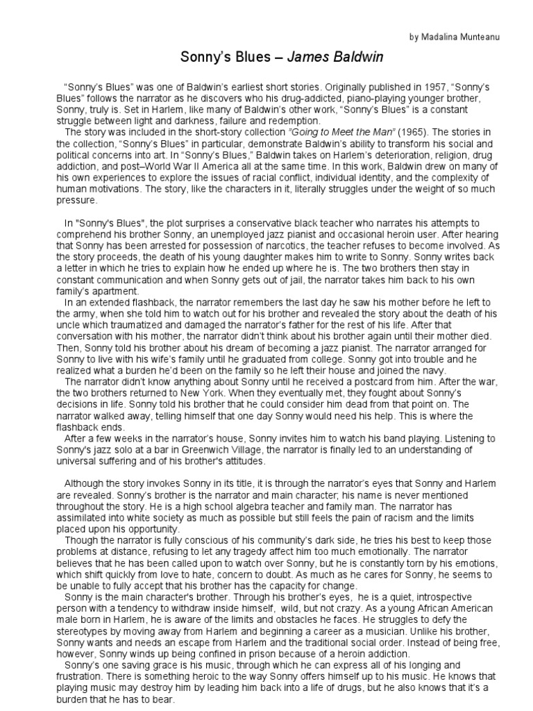The story starts when the narrator learns about his brothers. Teach your students to analyze literature like LitCharts does. Sonnys Blues James Baldwin Analysis 1003 Words 5 Pages Sonnys Blues by James Baldwin James Baldwins Sonnys Blues written in 1957 addresses the story of a jazz musician his struggles and triumphs in an era where racial segregation and civil rights movements brought big conflicts and important changes in our society.
