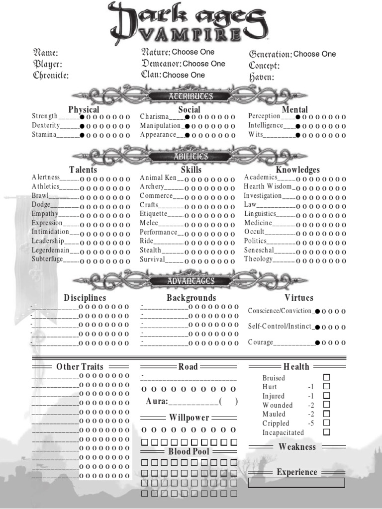 Dark Ages Vampire Editable Character Sheet 4 Pages Pdf Leisure