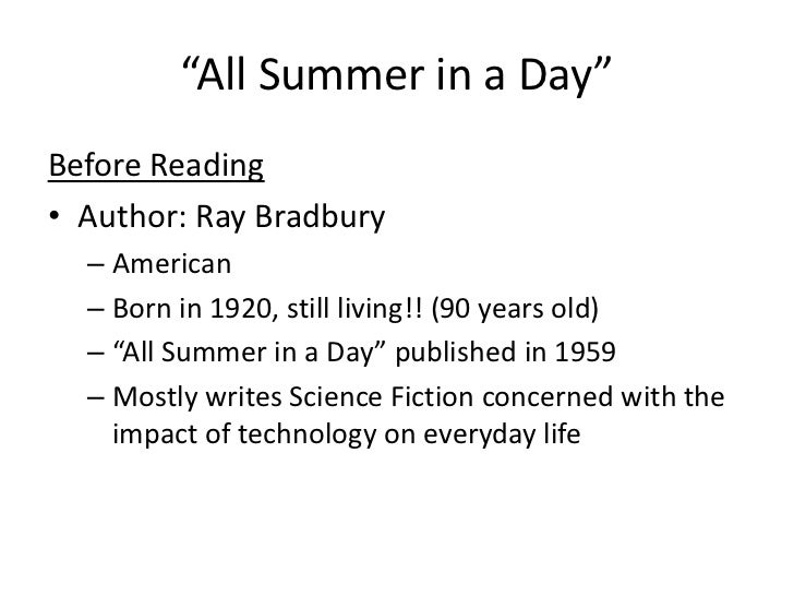 Ray Bradbury first saw the publication of his short story All Summer in a Day in the March 1954 issue of The Magazine of Fantasy and Science Fiction In the story children living on the planet Venus eagerly await the cessation of. Margot longs intensely for the sun which she read analysis of Margot. Margot shows her maturity through staying calm in times of chaos The Lottery.