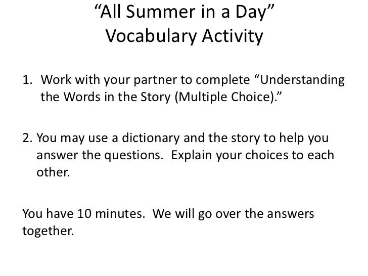 Then he tells her the sun wont actually come outit was all a joke. If they were Margot the main character after she was locked up and could not Build Understanding All Summerin a Day Background Venus. Margot loves the sun and misses seeing it because it is almost always raining on Venus.