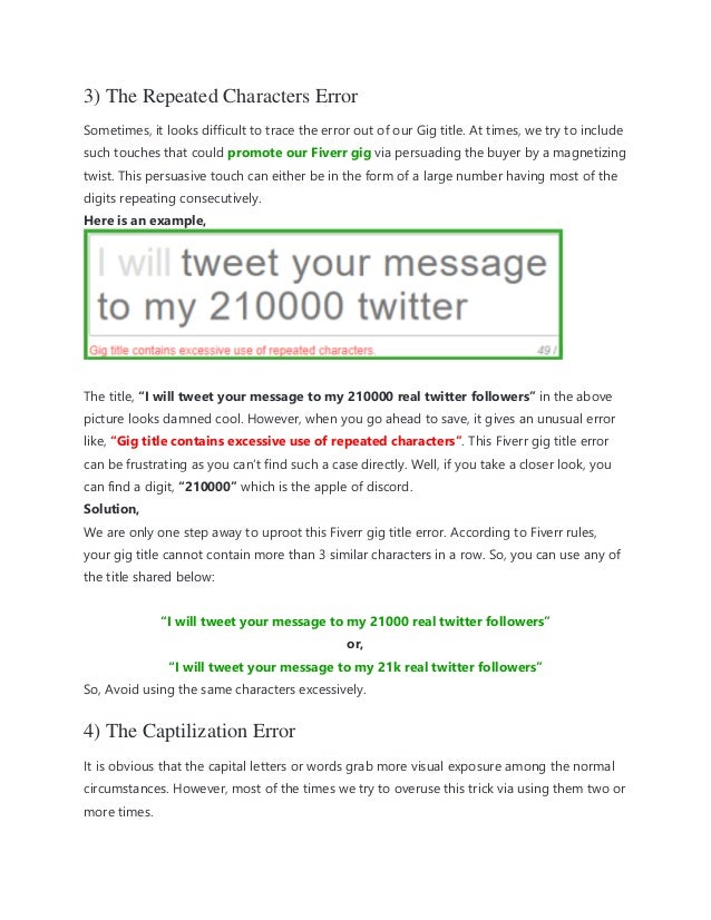 Gig title contains illegal characters fiverr. To find power words you have to analyze the other freelancers and their Gigs too. Logo Design is an original design for a logo uploaded by a Seller through the Fiverr Logo Maker. I will tweet your message to my 21000 real twitter followers or I will tweet your message to my 21k real twitter followers So Avoid using the same characters excessively.