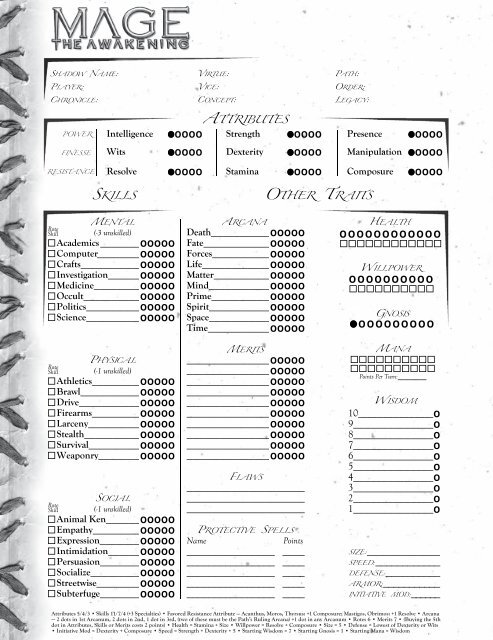 A Sheet for Everything The Awakened struggle to rebuild their societies and carve out their own kingdoms on Earth. Mage the Awakening 2nd ED NPC 2-Page Interactive Sheet. Choose Path Mage Template Choose your characters Path.
