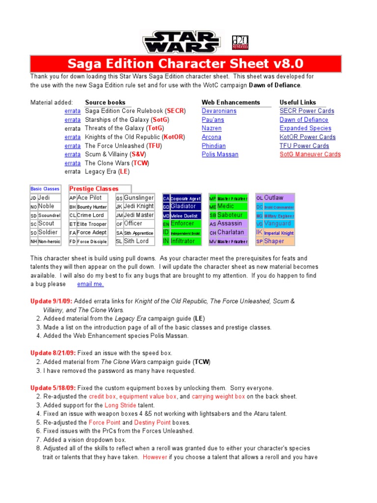 Heres my little timeline for this character sheet for Star Wars Saga Edition. Star wars d20 fillable Character sheet4159. Sagasheet 14 Ilmion Fixed 058 Character Generator 1.