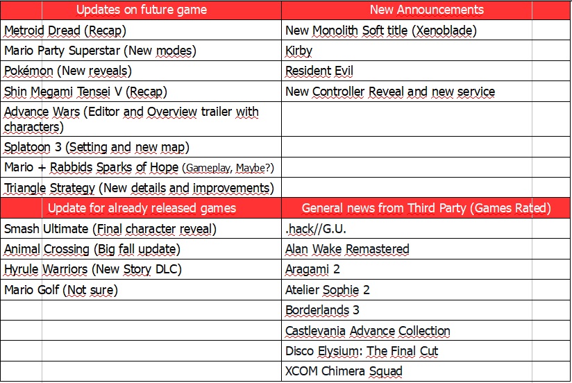 Samus Hunter Nintendo Leak And News Inside On Twitter I Post A Chart I Ve Made Over The Past Months To Keep Track Of Possible Reveals For The Nintendodirect Take The List