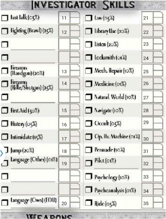 Investigators saved to your very own Character Control Panel where you can download a PDF character sheet choose a character portrait from a library of over 100 images or upload you own updates skills sanity and more. Click here for the Revised v35 System Reference Document. The formulas are based on the free Call of Cthulhu.