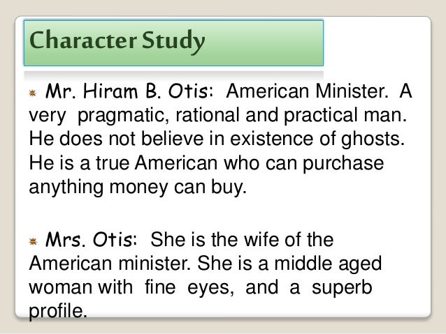 Mr Otis full name was Hiram B. He had 3 sons and a daughter. June 8th 2019 - Characters 1 Mr Hiram B Otis the American Minister he is new owner of the Chase 2 Mrs Lucretia Otis a healthy middle aged woman 3.
