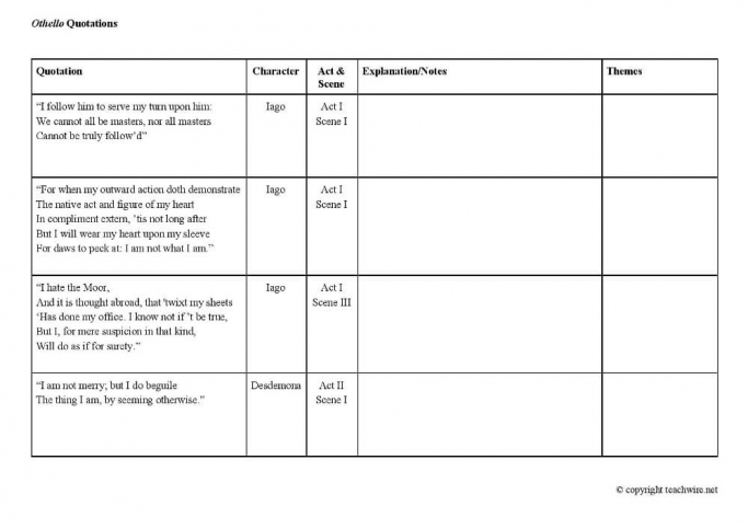 This printable worksheet resource contains worksheets for each major character in Othello by William Shakespeare to track the plot and character developments. Printable Character and Plot Worksheets. Read the extract and discuss the questions in small groups.
