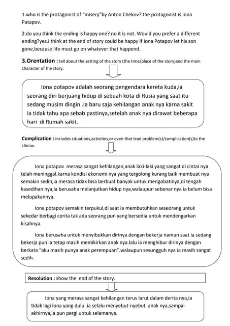 Anton Pavlovich Chekhov was a Russian short-story writer and playwright. The author described the passengers that took Ionas cab defining their character sketch. Misery or The Lament.