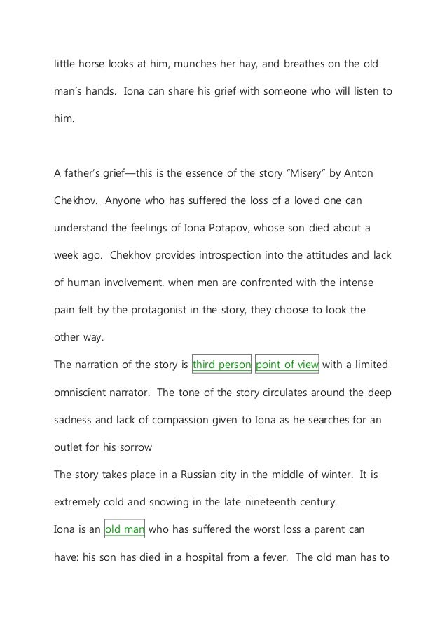 The surroundings amplify the sentiment of the main character Iona Potapov. The Lament Summary Misery by Anton Chekov Iona and his son Kuzma Ionitch are very close and affectionate.
