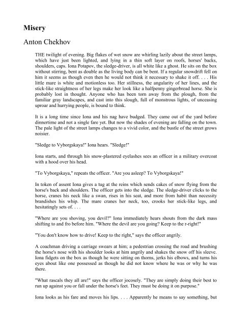 Антон Павлович Чехов was born in the small seaport of Taganrog southern Russia the son of a grocer. In Misery sled driver Iona Potapov is distraught because his son has died and he feels alone in the world. A thick wet snow is slowly twirling around the newly lighted street lamps and lying in soft thin layers on roofs on horses backs on peoples shoulders and hats.
