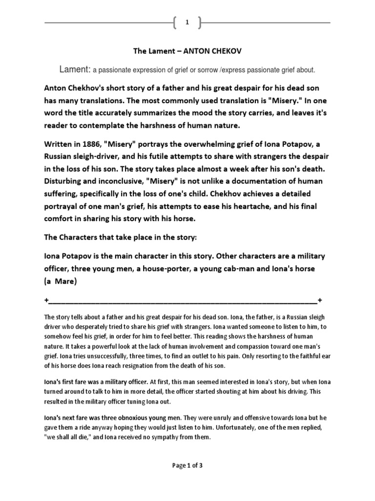 The Lament also known as Misery is a short story by Anton Chekhov about a Russian sledge driver whose son has recently died and his reactionsThe central theme of the story as the title. The title of the story does justice to the theme of the story which is of loneliness misery and. The story tells about a father and his great despair for his dead son.
